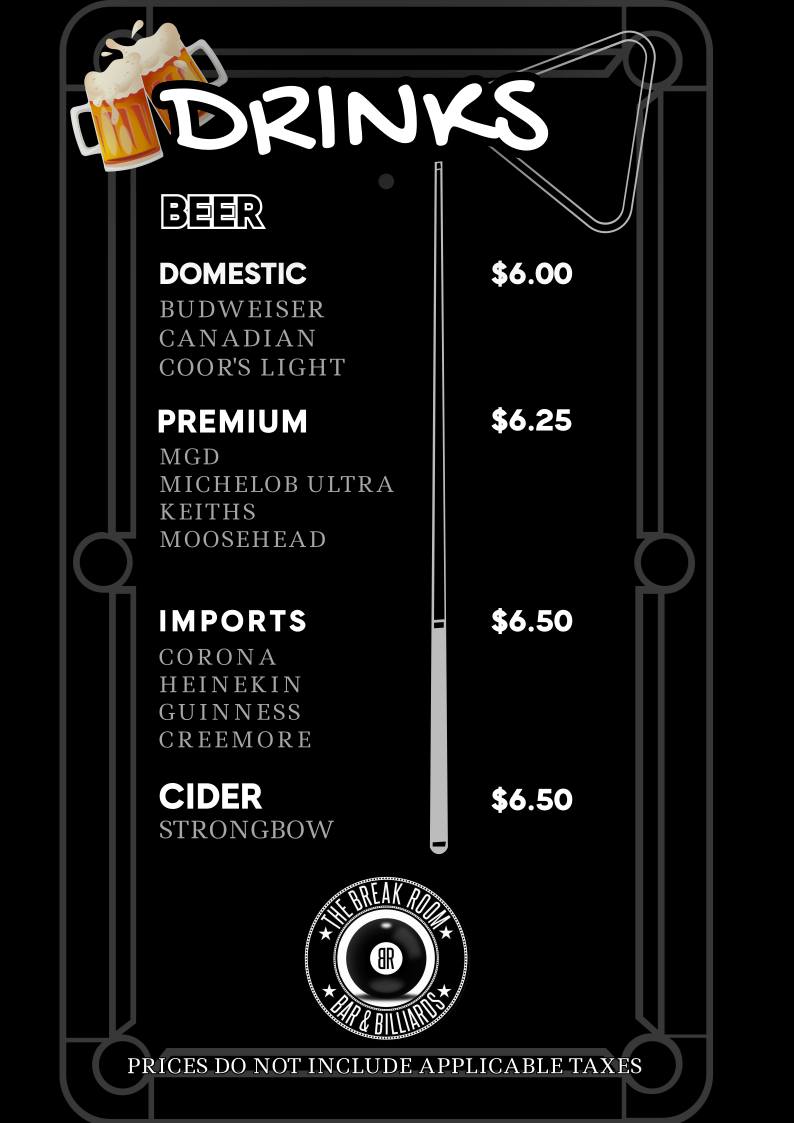 Food here is simple and satisfying, making it easy to grab a quick bite without interrupting the flow of the night. The drinks menu features a range of options from non-alcoholic beer and pop to spirits like rum, vodka, and gin, catering to different tastes and preferences. Whether you’re settling in with friends for a game or taking a break from the tables, the menu supports a laid-back, friendly atmosphere.